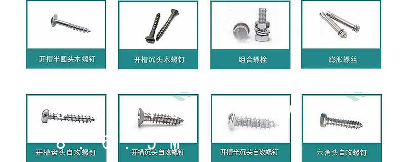 1.機螺釘 2.自攻螺釘 3.鉆尾螺釘 4.墻板釘 5.纖維板釘 6.木螺釘7.六角木螺釘 8.不脫出螺釘 9.組合螺釘 10.微型螺釘 11.家具螺釘 12.電子螺釘 13.鏈帶螺釘頭型 :1.六角頭(hexagon head)2.六角頭法蘭面(hexagon head with flange)3.方頭(square head)4.T形頭T head (hammer head5.